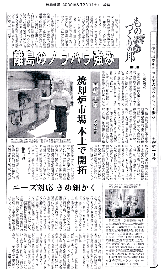 7/3の記事に引き続き、再度、琉球新報の「ものづくりの邦」というコーナーで、開邦工業を記事にしていただきました。